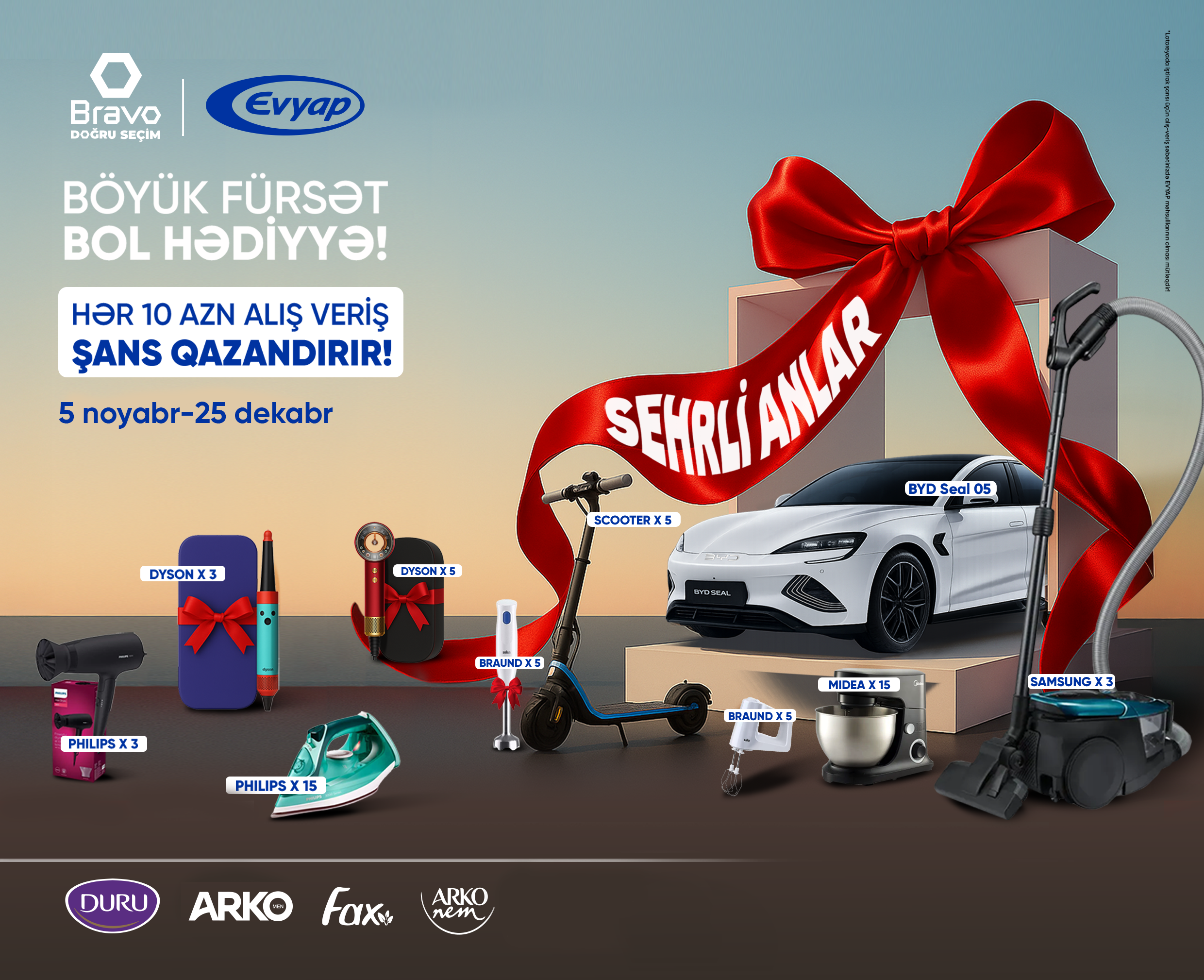 — Покупатель должен приобрести товары «Arko», «Fax» и «Duru» в магазинах Bravo на сумму не менее 10 манатов.